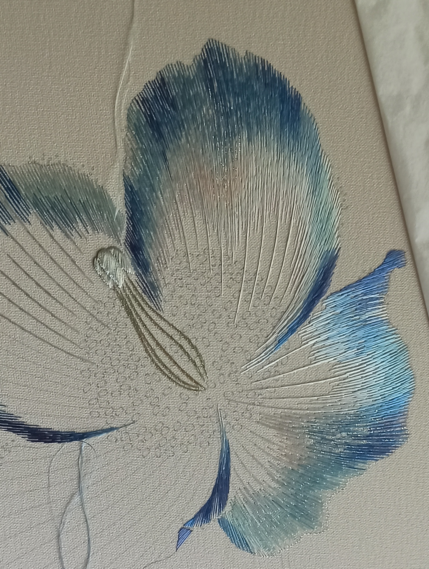In dit eerste blad ben ik nog aan het zoeken wat de kleuren doen en hoe ik het zilver kan gebruiken om het transparante en het zonlicht kan vangen. Naast een meerdere blauw tinten is er ook een turquoise. Deze heb ik met een aantal blauwen gemengd, waardoor voor mijn gevoel meer transparantie in het blad komt. Mijn keuze van lichtere kleuren geeft een delicater gevoel, de donkerblauw van het voorbeeld geeft een robuustere bloem. Ik vind donker blauw en fel blauw een moeilijke, harde kleur, vandaar mijn keuze voor de lichtere tinten en turquoise. Toch heb je de donkere en harde tinten nodig om diepte te geven aan het blad en de lichte tinten te ondersteunen.